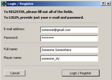 To login in to the TilingKing server, click the button in the toolbar labeled "Login" or else select the corresponding option from the File menu. The "Login/Register" dialog will appear. If this is your first time connecting to the TilingKing server, you must first register by providing your e-mail address, password, full name and your player name. After registering, you can login again by providing just your e-mail address and password.